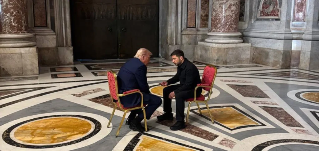 Володимир Зеленський та Дональд Трамп під час зустрічі у Ватикані 26 квітня — першої після суперечки в Овальному кабінеті. Фото: Андрій Єрмак / Telegram