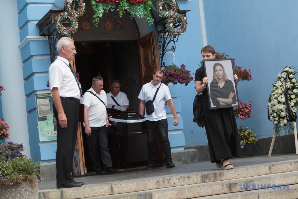 Українська журналістка Наталія Гуменюк тримає портрет убитої в російському полоні журналістки Вікторія Рощина під час церемонії прощання в Михайлівському соборі в Києві, 8 серпня. Рощина висвітлювала російські злочини на тимчасово окупованих територіях. Фото: Укрінформ