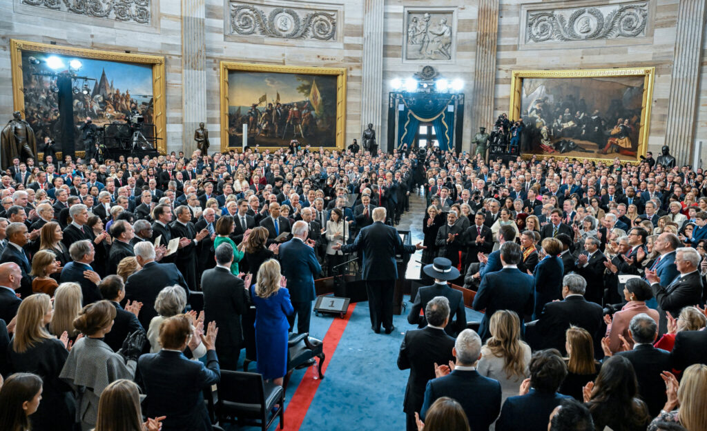 Дональд Трамп виступає з інавгураційною промовою в ротонді Капітолію у Вашингтоні, 20 січня 2025 року. У 78 років він став найстаршим президентом в історії країни, який вступив на посаду. Фото: Kenny Holston / The New York Times