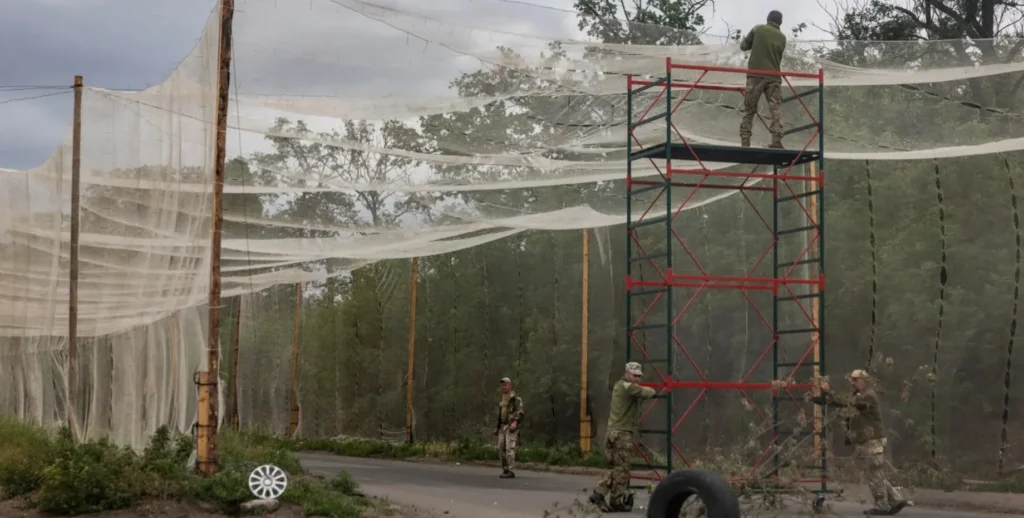 Українські військові натягують захисні сітки над дорогою до Костянтинівки, щоб убезпечити її від атак дронів. Фото: David Guttenfelder / The New York Times