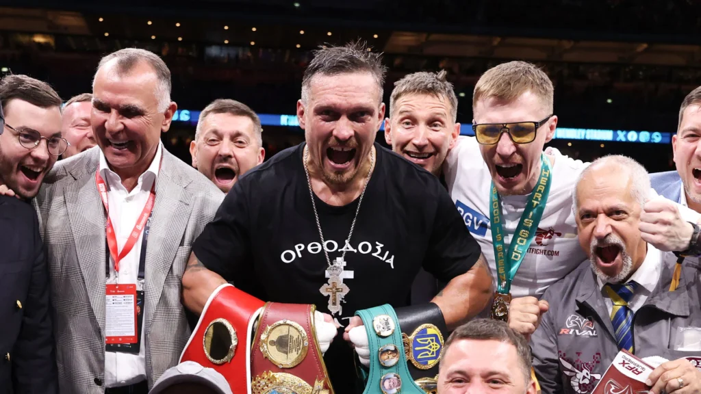 Олександр Усик із чемпіонськими поясами після перемоги над Даніелем Дюбуа на стадіоні «Вемблі» в Лондоні. 19 липня він втретє здобув титул абсолютного чемпіона світу. Фото: Richard Pelham / Getty Images