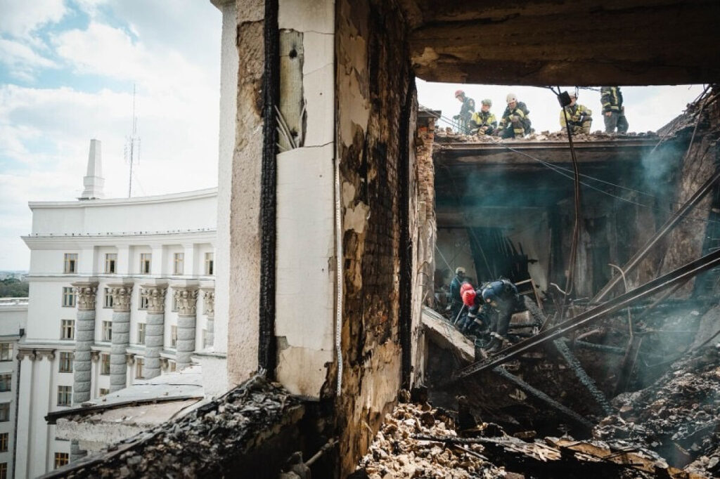 Будівля Кабінету міністрів після влучання російської балістичної ракети під час ранкової повітряної атаки 7 вересня. Унаслідок вибуху паливного бака почалася пожежа, яку рятувальники гасили близько двох годин. Фото: Кабмін