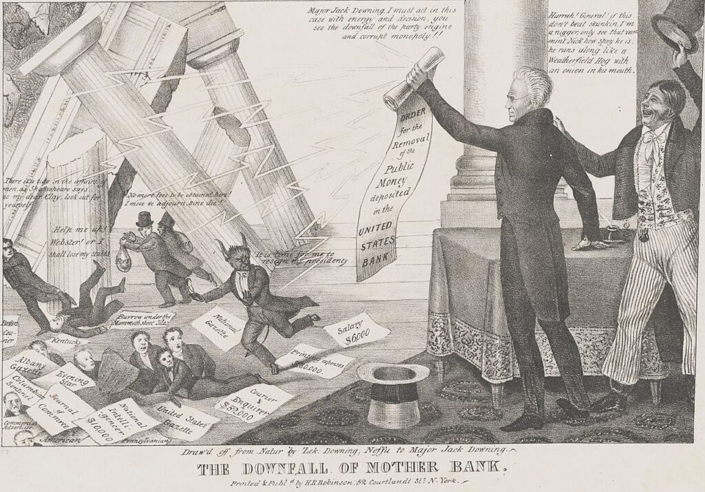 Джексон втілив ідею «президентства народу», але його підхід до управління був суперечливим. Він рішуче виступав проти концентрації економічної влади у Вашингтоні й бачив небезпеку в Національному банку США, який вважав інструментом інтересів фінансової еліти.