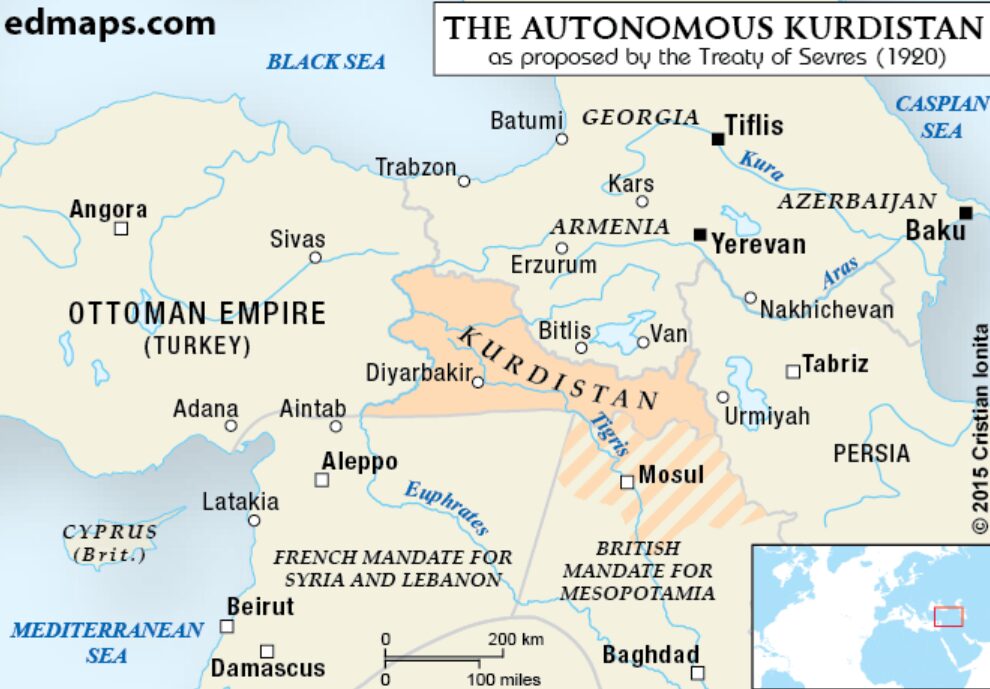 Після розпаду Османської імперії курдські території були поділені між кількома державами — Туреччиною, Іраком, Іраном і Сирією.